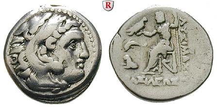 Lysimachos 323-281 v.Chr. Drachme 301-299 v.Chr. Lampsakos. Jugendlicher Herakleskopf im Löwenfell r. / Thronender Zeus hält Zepter und Adler, davor Delphin über Löwenvorderteil. Thomp. 32var.; sehr schön
