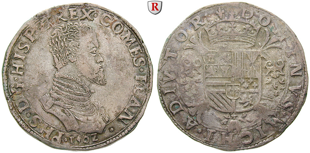 Philipp II. 1555-1598. Philippstaler 1562. Geharnischte Büste r. / Gekröntes Wappen auf Burgunderkreuz. Delm. 36; sehr schön