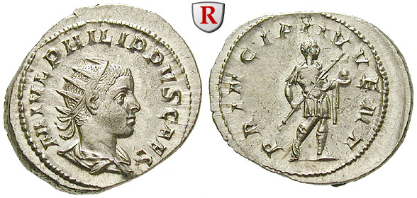 Zur Münzgeschichte: Schon als Caesar wurden für Philippus II. Münzen mit der Titulatur M IVL PHLIPPUS CAES geprägt. Die Aurei, Denare und Sesterzen zeigen eine barhäuptige Büste, da der Lorbeerkranz als Herrschaftssymbol nur dem Augustus zustand. Auf den Antoninianen trägt Philippus natürlich die Strahlenkrone, da sie hier das Nominal bezeichnet. Die Rückseitendarstellungen sind typisch für einen Caesar. Philippus II. zeigt sich als princeps iuventutis mit Globus oder Standarte und Speer als Herrschaftsattributen.