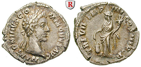 Zur Münzgeschichte: Die Münzprägung des Commodus unterteilt sich in drei signifikante Abschnitte. 175 bis 177 prägte er als Caesar. Die Münzen zeigen ein jugendliches Portrait, der Kopf trägt meistens keinen Lorbeerkranz. 177 bis 180 prägte Commodus als Augustus und Mitregent des Marcus Aurelius. Das Portrait zeigt noch immer recht jugendliche Züge, der Kopf ist allerdings meistens bekränzt. Die Titulatur ist L(ucius) AVREL(ius) COMMODVS. In den ersten Jahren seiner Alleinherrschaft ab 180 nennt er sich M(arcus) COMMODVS ANT(oninus) AUGVSTVS und verweist damit auf seinen Vater Marcus Aurelius und dessen Vorgänger Antoninus Pius. Ein fundamentaler Wechsel in der Titulatur findet 191 statt. Der Herrscher nennt sich nun L(ucius) AEL(ius) AVR(elius) COMMODVS und legt die beiden Namensteile, die sich auf seine Vorgänger beziehen, ab.