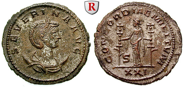 Nach der Ermordung Aurelians im Spätherbst 275 dauerte es mehrere Wochen, bis in Rom Tacitus zum neuen Herrscher bestimmt wurde. Doch auch während dieser Zeit mussten Münzen geprägt werden, damit der Staat seinen finanziellen Verpflichtungen nachkommen konnte. Diese Münzen tragen das Portrait von Severina. Die Rückseite zeigt die Göttin Concordia (Eintracht) mit Feldzeichen und die Inschrift CONCORDIAE MILITVM - Auf die Eintracht der Soldaten. Diese Prägungen wurden in fast allen Münzstätten in nicht geringer Zahl gemünzt. In jener schwierigen, herrscherlosen Zeit war es wichtig, daß das Heer nicht revoltierte und den staatlichen Organen Zeit ließ, einen neuen Herrscher einzusetzen. Severina, als noch amtierende Augusta, bewahrte für eine kurze Zeit die Autorität des Herscherhauses. Diese Frau muss zu Lebzeiten eine weitaus wichtigere Rolle gespielt haben, als uns aus den wenigen schriftlichen Quellen bekannt ist. Davon legen die Münzen beredtes Zeugnis ab.