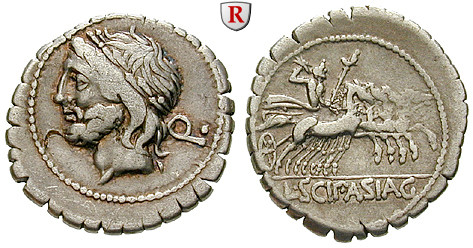 L. Scipio Asiagenus 106 v.Chr. Denar, serratus 21 mm 106 v.Chr. Rom. Kopf des Jupiter l. mit Lorbeerkranz, dahinter Kontrollzeichen P. / L SCIP ASIAG Jupiter r. in Quadriga. Cr. 311/1a; sehr schön, Bankmarke auf Vs.
