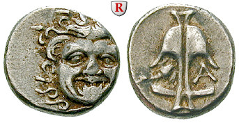 Drachme nach 400 v.Chr. Gorgoneion von vorn / Anker zwischen Garnele und A. SNG Cop. 456; sehr schön, dezentriert