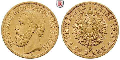 Friedrich I. 1852-1907. 10 Mark 1875 G. J. 186; GOLD, sehr schön