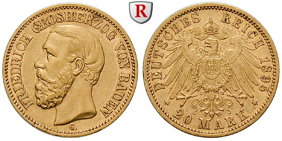 Friedrich I. 1852-1907. 20 Mark 1895 G. J. 189; GOLD, sehr schön +