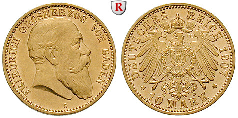 Friedrich I. 1852-1907. 10 Mark 1907 G. J. 190; GOLD, vorzüglich