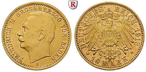 Friedrich II. 1907-1918. 10 Mark 1913 G. J. 191; GOLD, sehr schön - vorzüglich