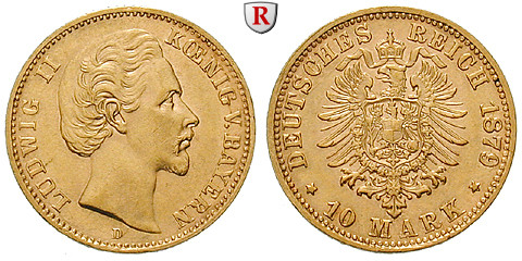 Ludwig II. 1864-1886. 10 Mark 1879 D. J. 196; GOLD, sehr schön - vorzüglich