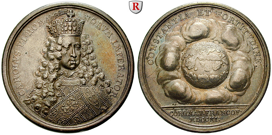 Karl VI. 1711-1740. Silbermedaille 37,8 mm 1711. (v. G.W.Vestner) auf seine Krönung zum Deutschen Kaiser in Frankfurt. Portrait en face mit der Reichskrone / Globus in Wolkenkranz und Wahlspruch. Slg. Mont. 1370; sehr schön - vorzüglich, Stempelfehler auf Vs.