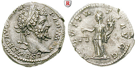 Zur Münzgeschichte: Wegen der großen Summen, die seine Feldzüge verschlangen, kam es zu einer deutlichen Münzverschlechterung. Die Denare enthalten teilweise nur noch 30-40 Prozent Silber, sind also aus Billon. Sie bilden auch das häufigste Nominal (Truppensold) und wurden in Rom, vielleicht auch in anderen Provinzen geprägt. Die Kaiserbilder auf ihnen ähneln stark denen von Pertinax, Clodius Albinus und Marc Aurel, um immer wieder auf die Nachfolge zu verweisen.