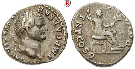 Zur Münzgeschichte: Vespasian gründete die neue Dynastie der Flavier und bestimmte direkt nach der Machtübernahme seine beiden Söhne Titus und Domitianus zu Nachfolgern als Caesaren. Auch durch seine Münzprägung versucht der Herrscher, diese Dynastie zu legitimieren. Von Anfang an prägten seine Söhne Titus und Domitianus Münzen mit ihren Portraits. Seltene Ausgaben besonders aus den ersten Regierungsjahren zeigen sogar alle drei Herrscher auf einer Münze.