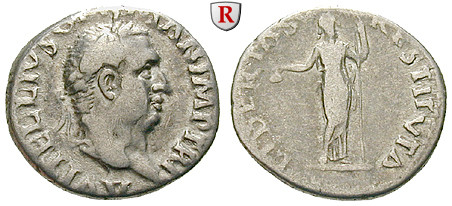 Zur Münzgeschichte: Die Münzstätte in Rom prägte erst vom 19. April an in Rom Münzen für Vitellius, an diesem Tag wurde er durch den Senat anerkannt. Das Geld, das Vitellius vorher benötigte, ließ er in Tarraco in Spanien und Lugdunum (Lyon) in Gallien prägen. Die Titulatur seiner Münzen weist einige Besonderheiten auf. Seit seiner Akklamation bezeichnete sich Vitellius als "Germanicus", diesmal nicht als Siegesname zu verstehen, sondern aufgrund seiner Erhebung in Germanien. Den Titel "Caesar" nahm er nie an und er erscheint auch nicht auf Münzen. Die Münzrückseiten betonen besonders den militärischen Aspekt der Treues des Heeres - FIDES EXERCITVVM - oder der Eintracht aller Bevölkerungsschichten - CONCORDIA. Sehr seltene Prägungen zeigen die Kinder des Herrschers - der zögerliche Versuch einer Dynastiegründung.