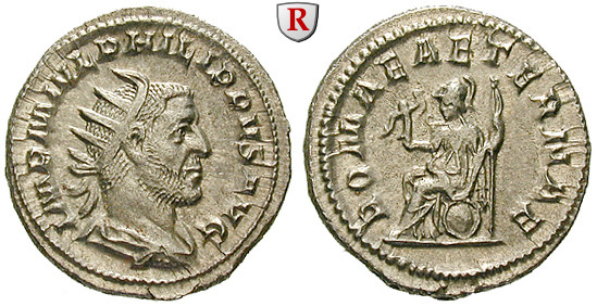 MARCUS JULIUS PHILIPPUS, genannt ARABS, wurde 198 n. Chr. im Ostjordanland als Sohn des Araberscheichs Marinus geboren. Über das Präfektenamt und mit Hilfe des Heeres gelangte er nach der Ermordung Gordians III. im Jahre 244 auf den römischen Kaiserthron. Von den Persern erkaufte er mit 1/2 Millionen Denaren den Frieden, eilte nach Rom und erklärte seinen Vorgänger zum Staatsgott. Als Kaiser regierte er mit Mäßigung und versuchte, das Reich aus dem Chaos hinauszuführen. Er erhob seinen gleichnamigen Sohn sofort zum Caesar, danach zum Augustus, seine Gemahlin Otacilia Severa zur Augusta.