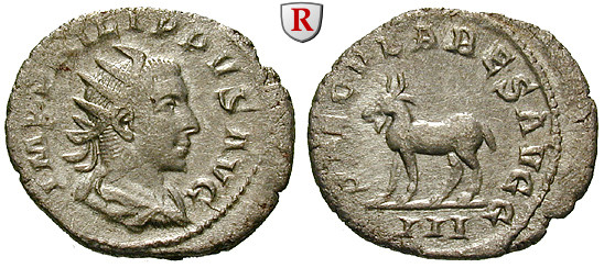 Zur Münzgeschichte: Schon als Caesar wurden für Philippus II. Münzen mit der Titulatur M IVL PHLIPPUS CAES geprägt. Die Aurei, Denare und Sesterzen zeigen eine barhäuptige Büste, da der Lorbeerkranz als Herrschaftssymbol nur dem Augustus zustand. Auf den Antoninianen trägt Philippus natürlich die Strahlenkrone, da sie hier das Nominal bezeichnet. Die Rückseitendarstellungen sind typisch für einen Caesar. Philippus II. zeigt sich als princeps iuventutis mit Globus oder Standarte und Speer als Herrschaftsattributen.