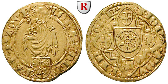 Konrad III. von Dhaun 1419-1434. Goldgulden o.J. (1420) Bingen. Stehender St. Petrus über Familienwappen / Fünf Wappen in Spitzvierpass. Friedb. 1622; GOLD, sehr schön +