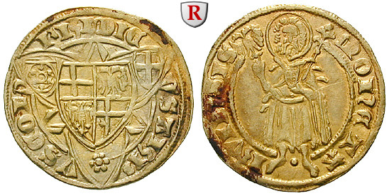 Friedrich II. von Saarwerden 1371-1414. Goldgulden o.J. (1413-1414) Bonn. Spitzdreipaß, darin geviertes Wappen Köln-Saarwerden, in den Winkeln Wäppchen von Mainz und Trier sowie Rosette / Johannes der Täufer, neben seinem Kopf der Doppeladler von Saarwerden. Friedb. 791; GOLD, sehr schön, l. bewegt