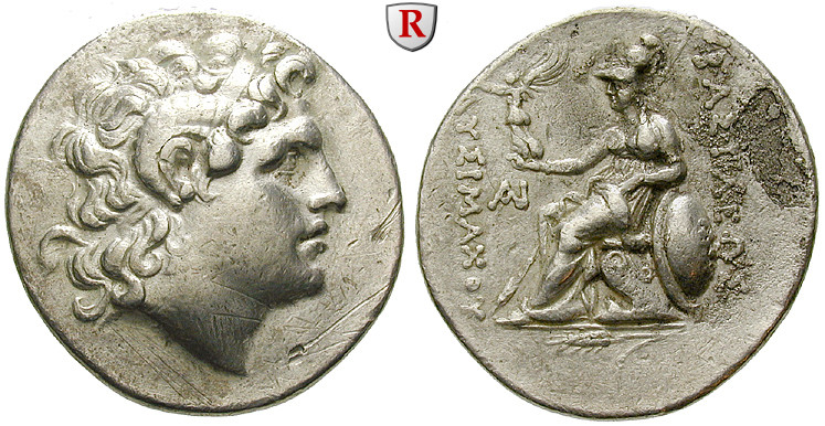 Lysimachos 323-281 v.Chr. Tetradrachme 32 mm 297-281 v.Chr. Amphipolis. Kopf Alexanders des Großen r. mit Ammonshorn / Athena thront l. mit Nike, Speer und Schild, darunter Ähre, l. Monogramm. Thomp. 212; sehr schön +, Vs. Kratzer, Rs. r. im Feld korrodierte Oberfläche