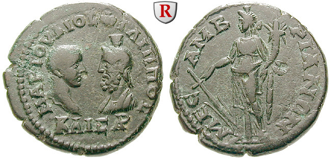 Philippus II., Caesar 244-247. Bronze 26 mm 244-247. Kopf des Philippus II. r. und drapierte Büste des Serapis l. mit Kalathos einander gegenüber / Tyche steht l. mit Steuerruder und Füllhorn. Varbanov 2693; sehr schön +, grüne Patina