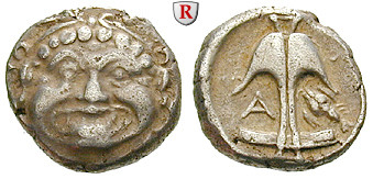 Drachme 14 mm 450-400 v.Chr. Gorgoneion v.v. / Anker, l. A, r. Garnele. SNG Cop. 452; sehr schön