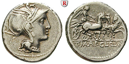 Appius Claudius Pulcher, T. Manlius Mancinus, und Q. Urbinus 111-110 v.Chr. Denar 17,5 mm 111-110 v.Chr. Rom. Behelmter Kopf der Roma r., dahinter Kontrollsymbol / T MA AP CL Q VR Victoria r. in Triga. Cr. 299/1b; sehr schön +