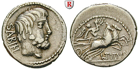 L. Titurius Sabinus 89 v.Chr. Denar 20 mm 89 v.Chr. Rom. Kopf des Tatius r. SABIN / L TITVRI Victoria r. in Biga; Mzz. im Abschnitt. Cr. 344/3; sehr schön, Rs. dezentriert
