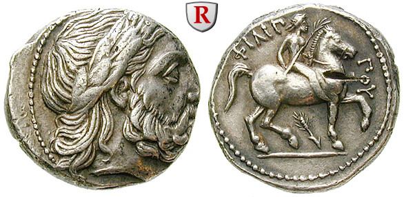 Philipp II. 359-336 v.Chr. Tetradrachme 23 mm 323-315 v.Chr. Amphipolis. Kopf des Zeus r. mit Lorbeerkranz / Nackter Reiter r. mit Palmzweig, darunter Ähre. LeRider 46/3var.; vorzüglich, knapper Schrötling, Rv. Prüfhieb