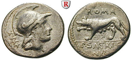 P. Satrienus 77 BC. Denarius 18,5 mm 77 BC Rome. Head of Mars right, control-number XXXX behind / ROMA P SATRIENVS She-wolf advancing left. Cr. 388/1b; very fine / good very fine