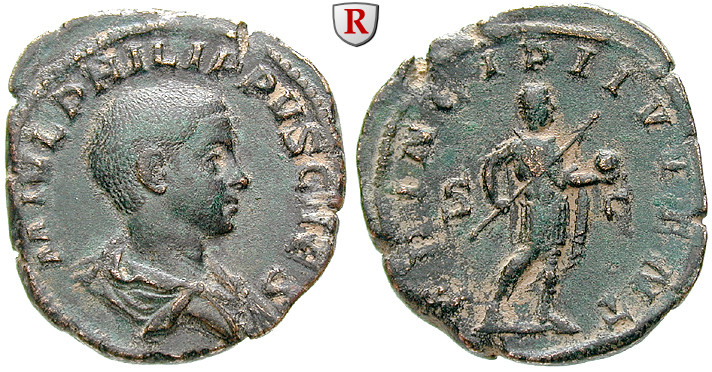 Zur Münzgeschichte: Schon als Caesar wurden für Philippus II. Münzen mit der Titulatur M IVL PHLIPPUS CAES geprägt. Die Aurei, Denare und Sesterzen zeigen eine barhäuptige Büste, da der Lorbeerkranz als Herrschaftssymbol nur dem Augustus zustand. Auf den Antoninianen trägt Philippus natürlich die Strahlenkrone, da sie hier das Nominal bezeichnet. Die Rückseitendarstellungen sind typisch für einen Caesar. Philippus II. zeigt sich als princeps iuventutis mit Globus oder Standarte und Speer als Herrschaftsattributen.
