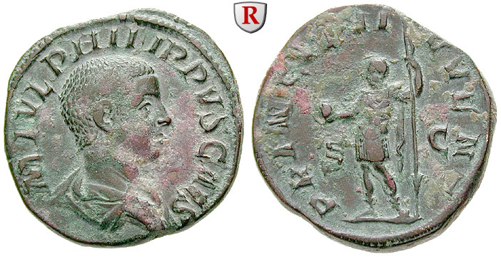 Zur Münzgeschichte: Schon als Caesar wurden für Philippus II. Münzen mit der Titulatur M IVL PHLIPPUS CAES geprägt. Die Aurei, Denare und Sesterzen zeigen eine barhäuptige Büste, da der Lorbeerkranz als Herrschaftssymbol nur dem Augustus zustand. Auf den Antoninianen trägt Philippus natürlich die Strahlenkrone, da sie hier das Nominal bezeichnet. Die Rückseitendarstellungen sind typisch für einen Caesar. Philippus II. zeigt sich als princeps iuventutis mit Globus oder Standarte und Speer als Herrschaftsattributen.