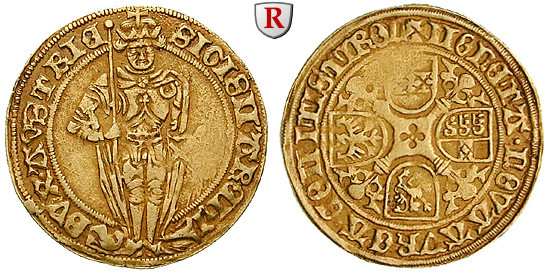 Erzherzog Sigismund der Münzreiche 1439-1490. Goldgulden o.J. Hall. Erzherzog mit geschultertem Zepter von vorn stehend / Blumenkreuz, in den Winkeln vier Wappen. Friedb. 6; GOLD, sehr schön, leichte Prägeschwäche