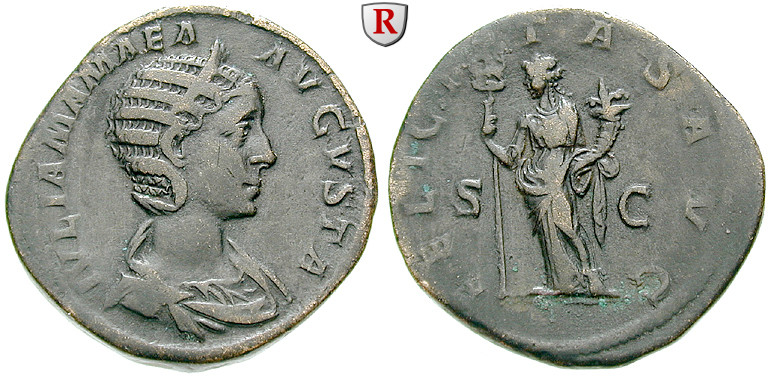 Zur Münzgeschichte: Kurz nach der Thronbesteigung des Severus Alexander im März 222 erhielt Julia Mamaea den Titel einer Augusta und während der gesamten Regierungszeit ihres Sohnes wurden in ihrem Namen Münzen in allen Metallen geprägt. Wie bei den Frauen des Kaiserhauses üblich, zeigen die Münzrückseiten hauptsächlich weibliche Gottheiten. Damit wurde die Herrscherin in die Nähe von Juno, Venus oder Felicitas gerückt.
