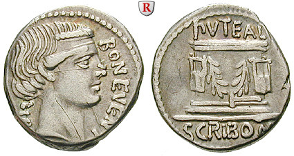 L.Scribonius Libo 62 v.Chr. Denar 18 mm 62 v.Chr. Rom. Kopf des Bonus Eventus r. BON EVENT LIBO / PVTEAL SCRIBON Puteal Scribonianum, mit Lyren und Girlanden geschmückt, unten Hammer. Cr. 416/1a; sehr schön, Kratzer auf Vs.