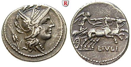 L. Julius 101 BC. Denarius 19 mm 101 BC Rome. Helmeted head of Roma right; behind corn-ear / L IVLI ROMA Victory in biga right. Cr. 323/1; good very fine, graffiti on obv.