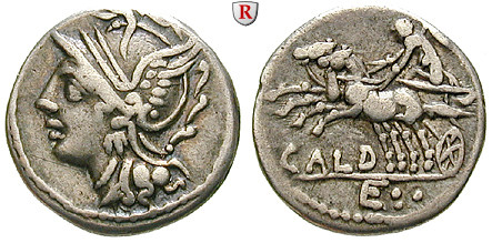 C. Coelius Caldus 104 v.Chr. Denar 18 mm 104 v.Chr. Rom. Behelmter Kopf der Roma l. / CALD Victoria l. in Biga, Kontrolzeichen E°° im Abschnitt. Cr. 318/1b; sehr schön