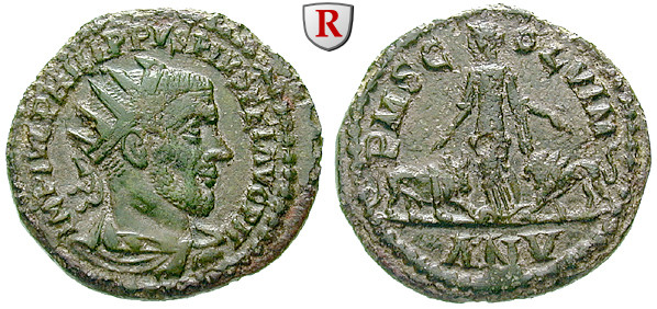 Philippus I. 244-249. Bronze 24,5 mm Jahr 5 = 244-245. Drapierte Büste r. mit Strahlenkrone IMP IVL PHILIPPVS PIVS FEL AVG PM / PMS COL VIM AN V Dacia steht zwischen Löwe und Stier. BMC 17; fast vorzüglich