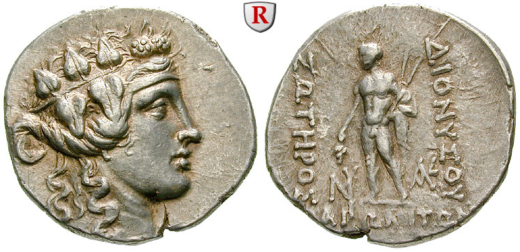 Tetradrachme 32 mm nach 146 v. Chr. Kopf des Dionysos mit Efeukranz r. / Nackter Dionysos steht l., hält Weintraube und zwei Stäbe; unten zwei Monogramme. Sch.-Geiss 1119 vgl.; vorzüglich / sehr schön