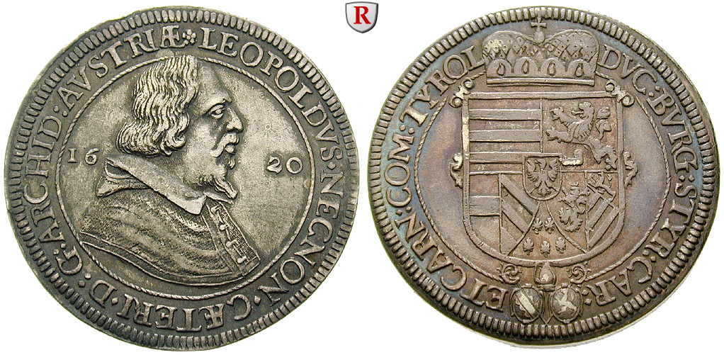 Erzherzog Leopold V. 1619-1632. Taler 1620 Hall. Brustbild rechts / Gekröntes Wappen, darunter die Schilde Straßburgs und Passaus. Dav. 3328; fast vorzüglich