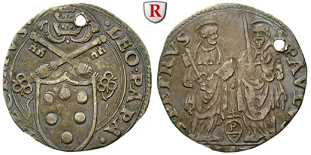 Leo X. 1513-1521. Giulio o.J. Ancona. Schlüssel und Tiara über Wappen / St. Peter und St. Paulus, zw. ihnen Schild des Münzmeisters Paolo Sinibaldi. Berman 668; sehr schön, gelocht