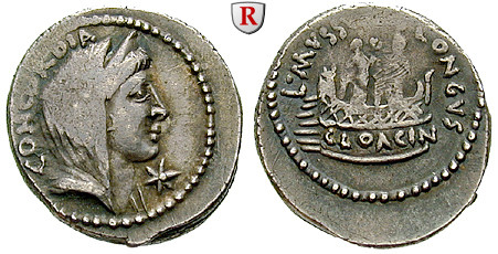 L. Mussidius Longus 42 v.Chr. Denar 19 mm 42 v.Chr. Rom. Verschleierter Kopf der Concordia r. mit Diadem, Stern unter Kinn CONCORDIA / L MVSSIDIVS LONGVS Heiligtum der Venus Cloacina (auf dem Forum Romanum) mit zwei Götterstatuen, auf der Basis CLOACIN. Cr. 494/42b; sehr schön +, Druckstellen; dezentriert