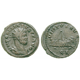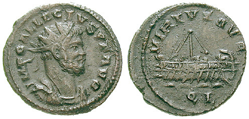 Allectus 293-296. AE-Antoninian 20 mm 293-296 London. Drapierte Büste r. mit Strahlenkrone IMP C ALLECTVS P F AVG / VIRTVS AVG Galeere l., Mzz. QL. RIC 55; sehr schön, dunkle Patina