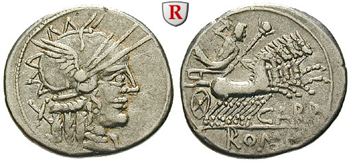 Cn. Papirius Carbo 121 v.Chr. Denar 21,5 mm 121 v.Chr. Rom. Behelmter Kopf der Roma r., dahinter Wertzeichen X / CARB ROMA Jupiter r. in Quadriga. Cr. 279/1; sehr schön