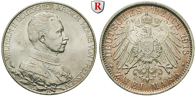 Wilhelm II. 1888-1918. 2 Mark 1913 A. Regierungsjubiläum. J. 111; stempelfrisch