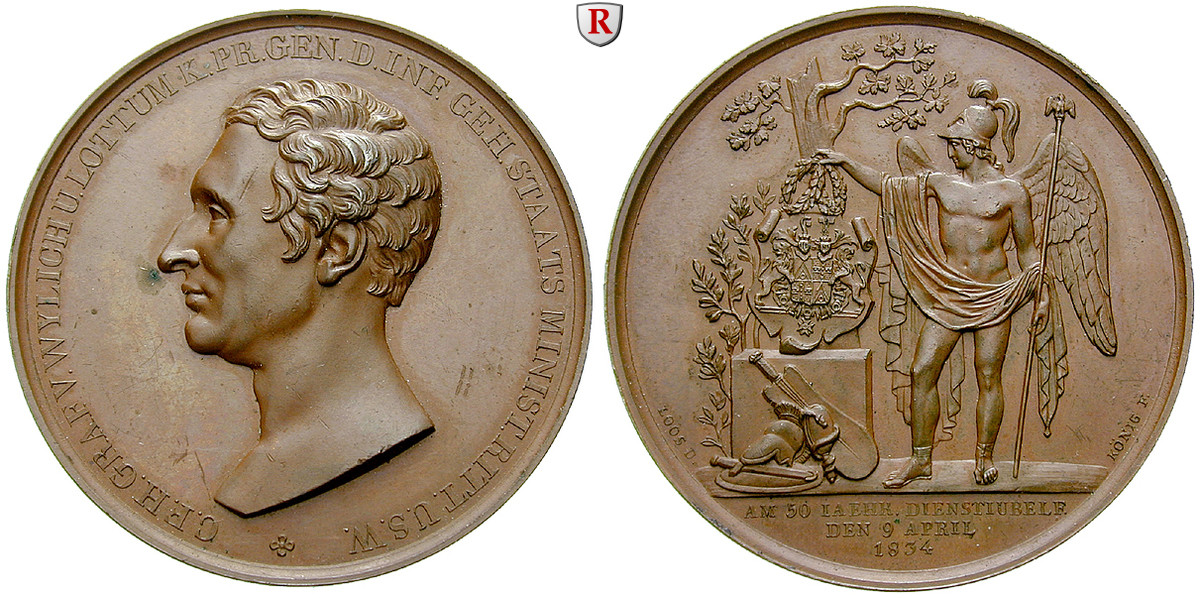 Wylich und Lottum, Carl Friedrich Heinrich Graf von - Preußischer General und Staatsminister 1767-1841. Bronze-Bronzemedaille 50,6 mm 1834. (v. König / Loos), auf das 50jährige Dienstjubiläum. Büste links / Wappenschild des Ministers lehnt an einer Eiche, wird von Mars bekränzt. Wurzb. 9895; fast stempelfrisch, kl. Fleck