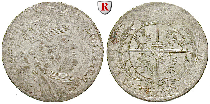 Friedrich August II. 1733-1763. 18 Gröscher 1754 Leipzig. Für Polen. Kopicki 2111; fast vorzüglich, Prägeschwäche