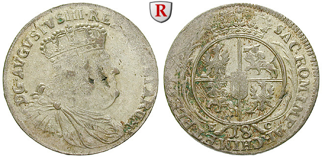 Friedrich August II. 1733-1763. 18 Gröscher Datum nicht lesbar (1754-56) Leipzig. Für Polen. Kopicki 2108ff; sehr schön +, Prägeschwäche, Schrötlingsfehler