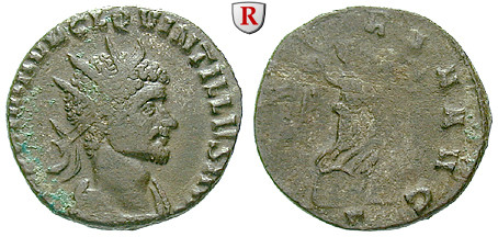 Quintillus 270. AE-Antoninian 18 mm 270 Rom. Gepanzerte Büste r. mit Strahlenkrone IMP C M AVR CL QVINTILLVS AVG / VICTORIA AVG Victoria schreitet r., hält Kranz und Palmzweig; Mzz. gamma. RIC 33; sehr schön + / fast sehr schön