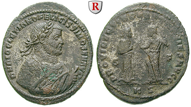 Zur Münzgeschichte: Um die inflationäre Währung zu stabilisieren, standartisierte Diocletianus das ganze Münzwesen. Er führte einen Aureus (Gold zu 5,45 g), einen Argenteus (Silber zu 4,6 g) und eine völlig neue Bronzemünze ( Durchmesser zu Anfang ca. 28 mm), den Follis, ein. Die Abbildungen auf der Rückseite der Münzen wurden auf wenige Typen reduziert, die Portraits auf den Vorderseiten im Sinne des Kaiserkultes stilisiert. Alle Münzstätten (Rom, Lyon, Trier, Nicomedia, Antiochia, Alexandria u.a.) kennzeichneten die Münzen durch Buchstaben und Zahlen nach Ausgabeort, Werkstatt und Emission.