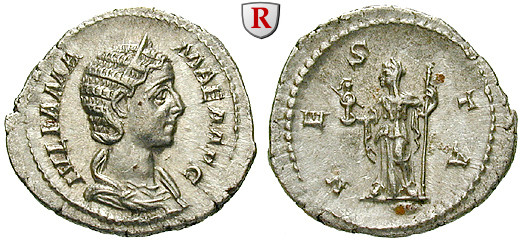 Zur Münzgeschichte: Kurz nach der Thronbesteigung des Severus Alexander im März 222 erhielt Julia Mamaea den Titel einer Augusta und während der gesamten Regierungszeit ihres Sohnes wurden in ihrem Namen Münzen in allen Metallen geprägt. Wie bei den Frauen des Kaiserhauses üblich, zeigen die Münzrückseiten hauptsächlich weibliche Gottheiten. Damit wurde die Herrscherin in die Nähe von Juno, Venus oder Felicitas gerückt.