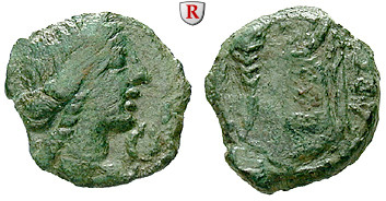 Bronze 14 mm 77-44 v.Chr. Kopf der Artemis r. mit Diadem, Kranz unterhalb des Kinns VOLCAE / AREC Togatus steht l., l. im Feld Palmzweig. Castelin 109f.; sehr schön