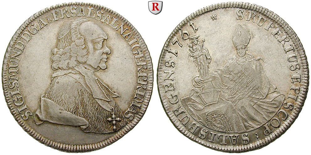 Sigismund von Schrattenbach 1753-1771. Taler 1761. Bust right / St. Rupert sitting at table with salt vessel and Madonna. Dav. 1254; very fine to extremely fine